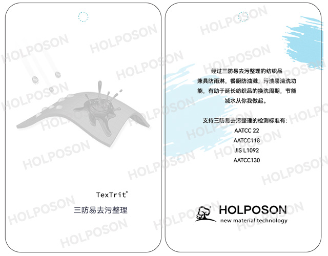 HOLPOSON? Smart Clean-T  親水易去污整理劑 HOLPOSON? Smart Clean-T 是經過特殊改性聚酯類親水易去污整理劑,能夠賦予加工織物良好的親水,抗靜電,吸濕速干,蓬潤性等性能,且耐洗性達50次以上(JIS L0217. 103法,連續洗滌法)經過易去污整理后的紡織品面料,在一定程度上可以清水擦除所沾污漬,如:醬油,番茄醬,玉米油,圓珠筆油污等。滿足家庭主婦對淺色衣物易打理易清潔的要求。使難去除、易殘留的臟污,可以去除干凈,達到污所不落,節能去污。HOLPOSON? Smart Clean-T 適用于天然纖維、合成纖維及其混紡織物,目前易去污整理可用于開發淺色系列的童裝面料,羽絨服面料,沙發面料,工裝,職業裝,襯衫,白T恤等等。