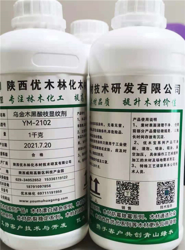 1:優木寶YM-2101YM-2120環保型系列烏金木顯紋劑是一種提高木材紋理和木材色彩活性的優質產品,讓木材質感提高,價值提高,優木寶YM-2101YM-2120系列是和木材反應成色的新型改色,現被廣泛應用在新中式古典家具和名貴木材上,提高木材價值和質感,優木寶顯紋劑系列滲透性強,可以拉深木紋2㎜左右,不影響后序砂光,從而達到木材層次分明,醇厚感強,紋理清晰.