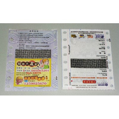 廠家專(zhuān)業(yè)印刷手機(jī)充值券,電子話(huà)費(fèi)充值券印刷,保密紙充值券印刷,充值券密碼紙印刷等適用于電信、移動(dòng)、鐵通、網(wǎng)絡(luò)通信等預(yù)付費(fèi)充值業(yè)務(wù)。常用規(guī)格有76*80/76*101.6mm等,兩聯(lián)或者三聯(lián);本產(chǎn)品采用高級(jí)無(wú)碳復(fù)寫(xiě)原紙,特殊加密印刷工藝,標(biāo)準(zhǔn)電腦孔位,具有無(wú)碳復(fù)寫(xiě)、電腦連續(xù)打印、數(shù)據(jù)信息保密功能。備注:本公司為保密卡承印廠商,歡迎零售或批發(fā)商請(qǐng)與發(fā)行商來(lái)電定制,免費(fèi)索取樣品,本公司真誠(chéng)期待為您服務(wù)!