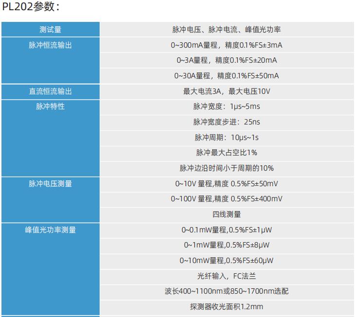 測試量 脈沖電壓、脈沖電流、峰值光功率