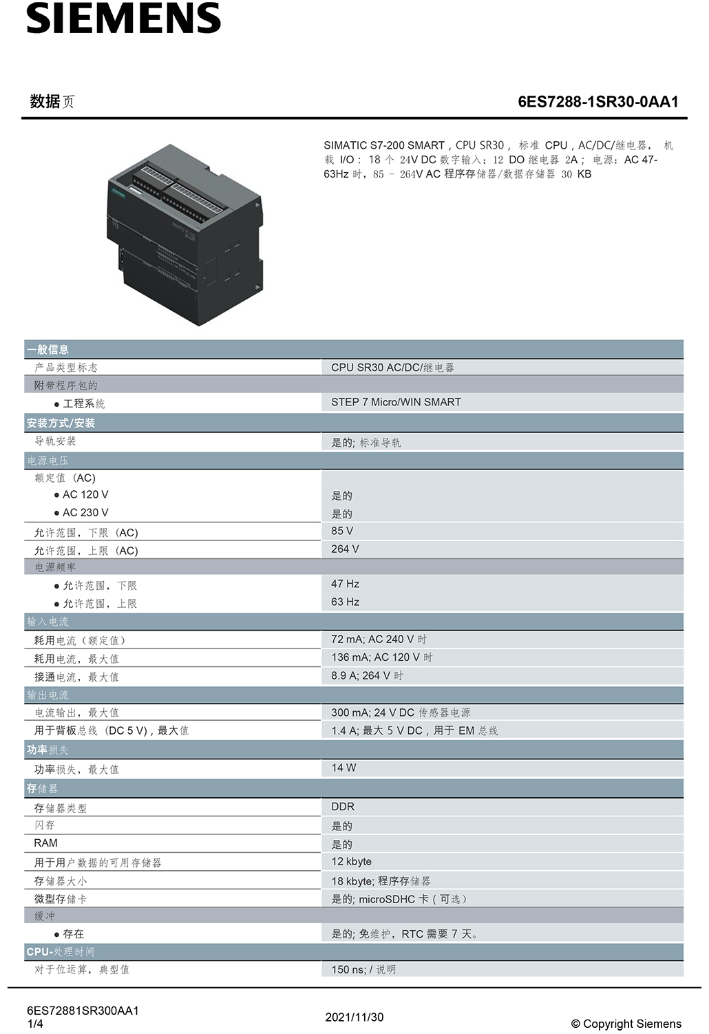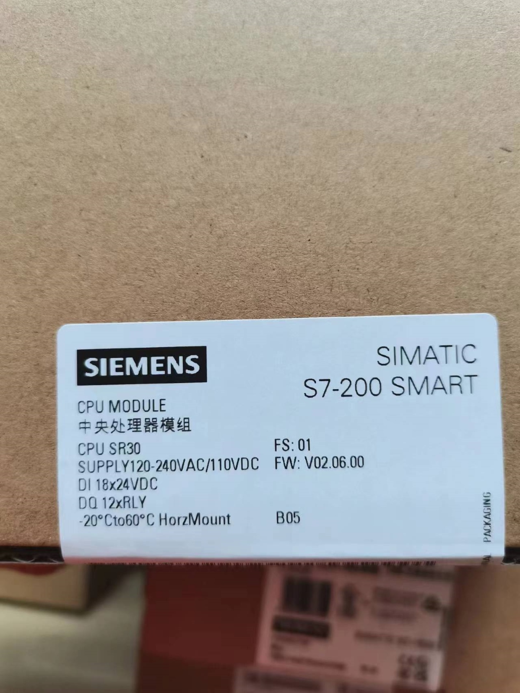SIMATIC S7-200 SMART,CPU SR30, 標準 CPU,AC/DC/繼電器, 機載 I/O: 18 個 24V DC 數字輸入;12 DO 繼電器 2A; 電源:AC 47-63Hz 時,85 - 264V AC 程序存儲器/數據存儲器 30 KB