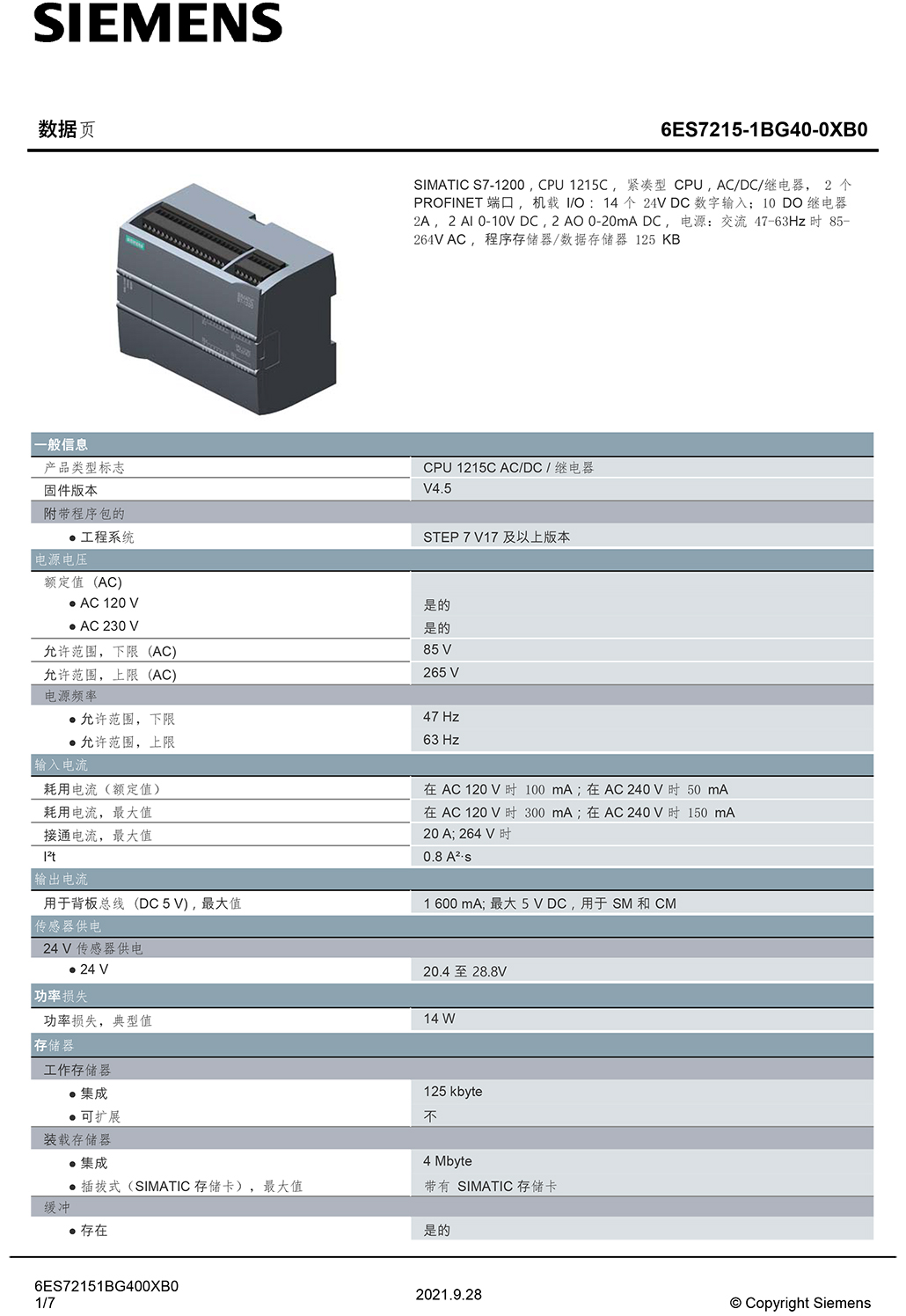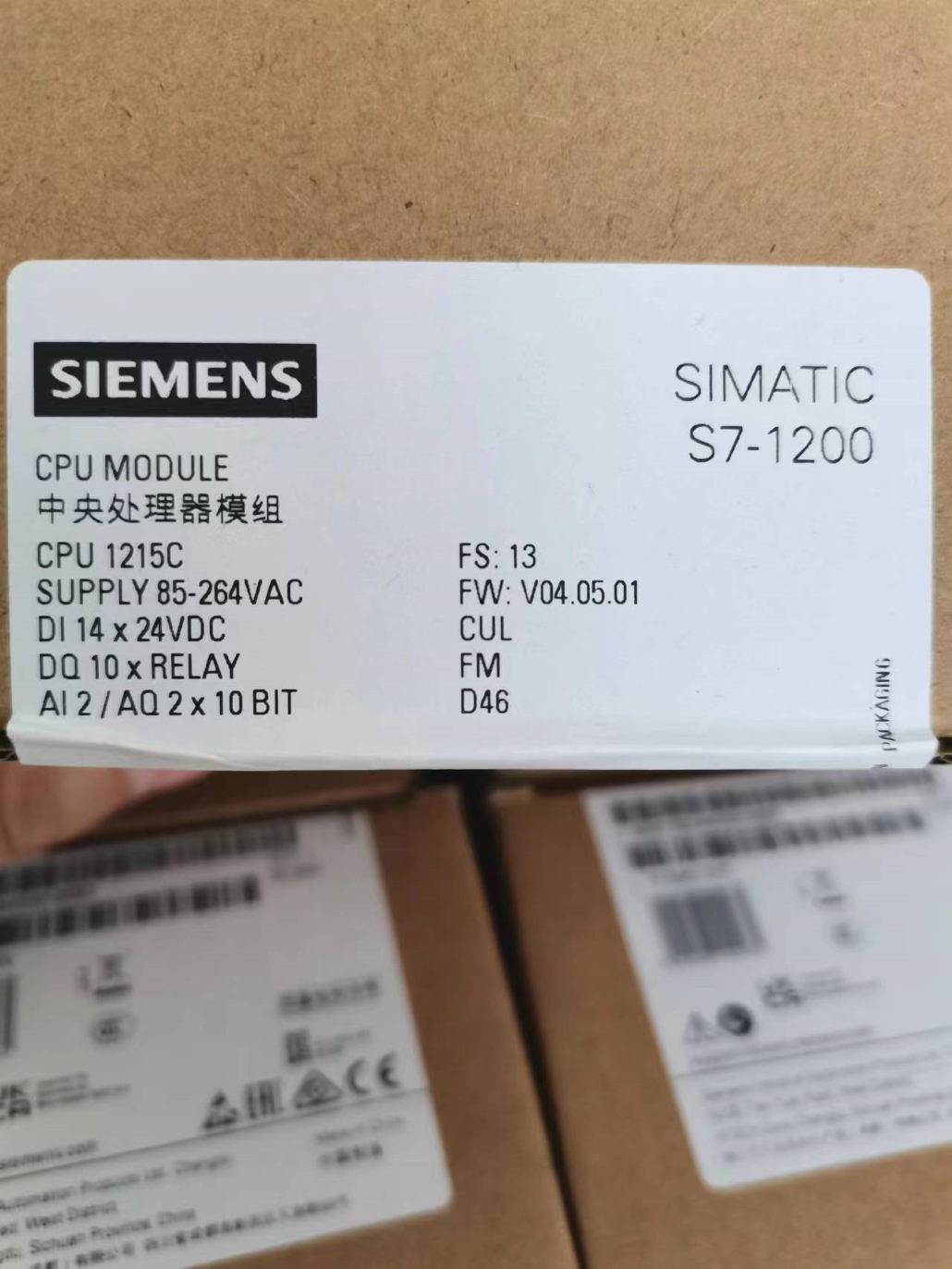 SIMATIC S7-1200,CPU 1215C, 緊湊型 CPU,AC/DC/繼電器, 2 個 PROFINET 端口, 機載 I/O: 14 個 24V DC 數字輸入;10 DO 繼電器 2A, 2 AI 0-10V DC,2 AO 0-20mA DC, 電源:交流 47-63Hz 時 85-264V AC, 程序存儲器/數據存儲器 125 KB
