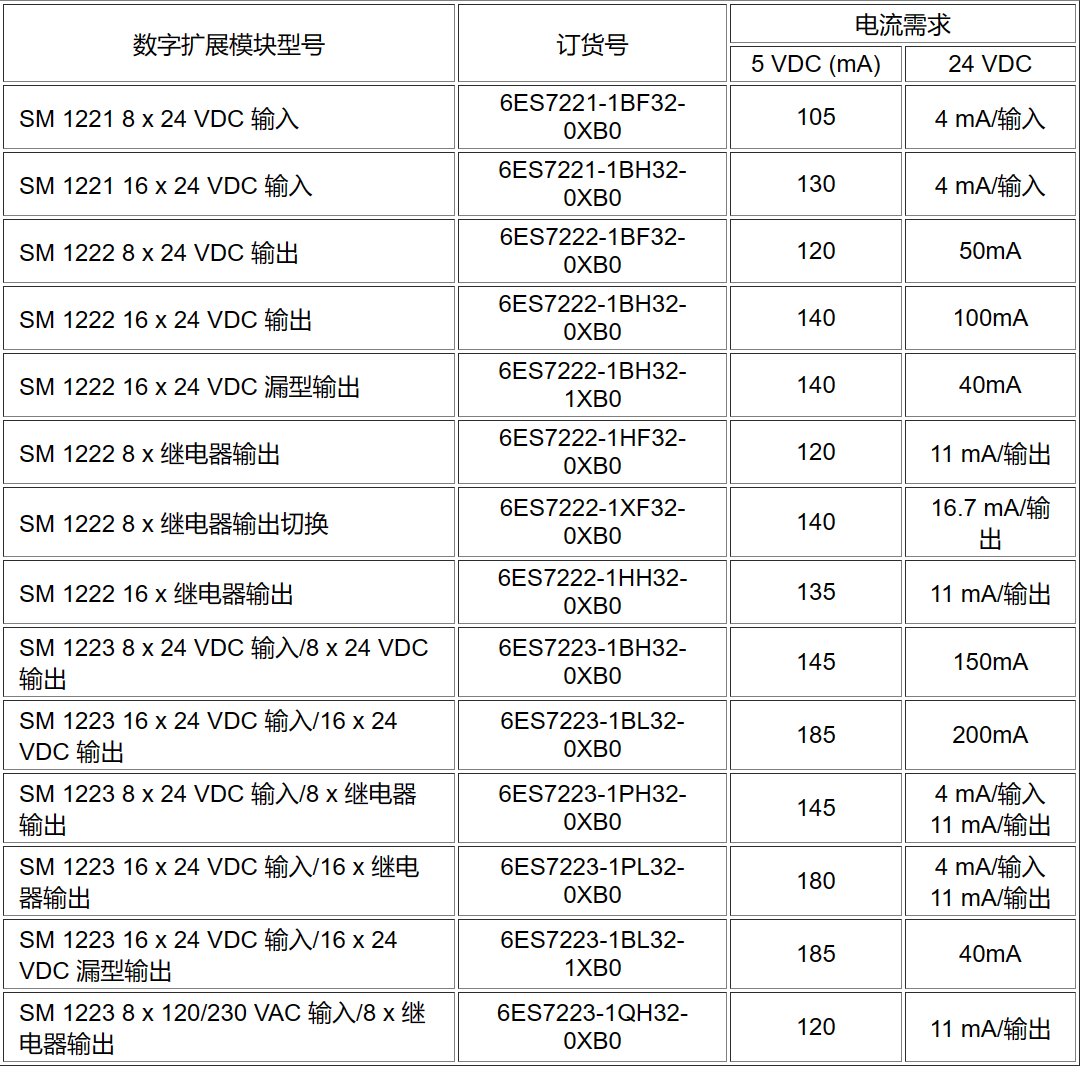 5VDC電源需求請參考S7-1200 PLC電源需求與計算,其它影響因素請參考如下表1 。