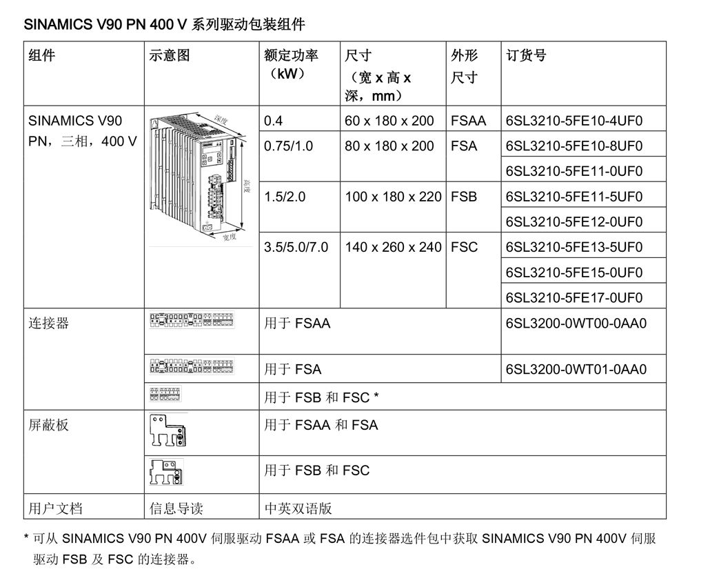 SINAMICS V90,含 PROFINET 輸入電壓: 200-240 V 1 相/三相交流 - 15 %/+ 10 % 5.0 A/3.0 A 45-66 輸出電壓:0 – 輸出 2.6 A 0-330 Hz 電機:0.4 kW 防護等級:IP20 尺寸 B, 55x170x170(寬x高x深)