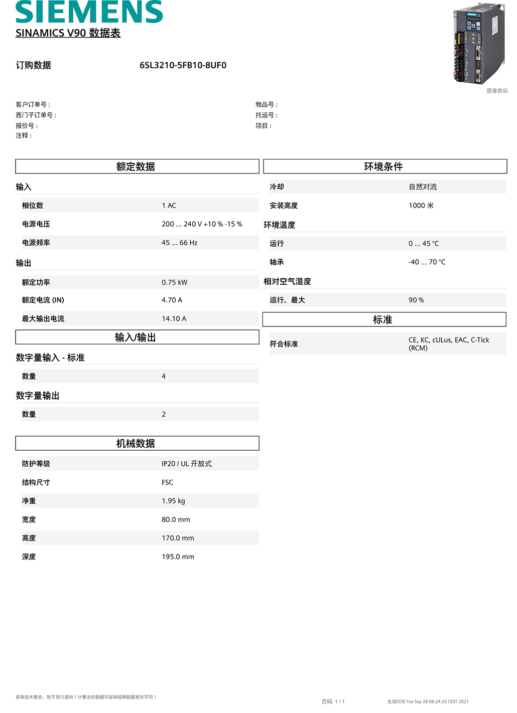 SINAMICS V90,含 PROFINET 輸入電壓: 200-240 V 1 相/三相交流 -15 %/+10 % 10.4 A/5.0 A 45-66 輸出電壓:0 – 輸出 4.7 A 0-330 Hz 電機:0.75 kW 防護等級:IP20 尺寸 C, 80x170x195(寬x高x深)