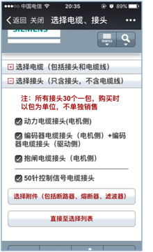 在圖3-7中點擊“選擇電纜”,進入到選擇電纜、接頭界面。SNAMICS V90伺服驅動器與西門子伺服電機1FL6之間需要配置的電纜有三個,分別是動力電纜、編碼器信號電纜和抱閘電纜(對于帶抱閘電機)。V90與上級控制器之間需要配置控制信號電纜。在“選擇電纜”目錄下可以選擇所需的電纜及長度。如圖3-8所示。