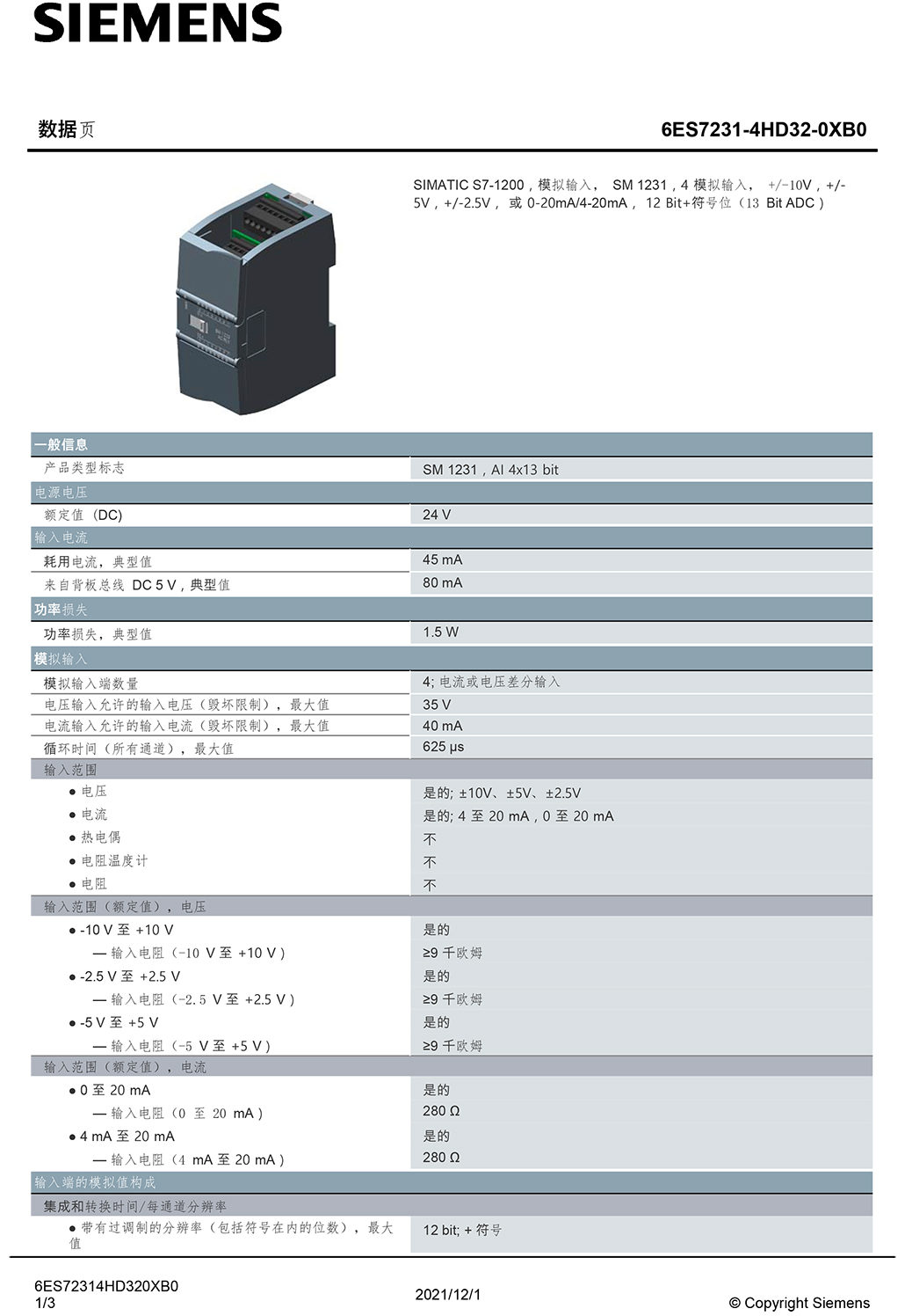 供應全新原裝西門子6ES7231-4HD32-0XB0,SIMATIC S7-1200,模擬輸入,SM 1231,4模擬輸入