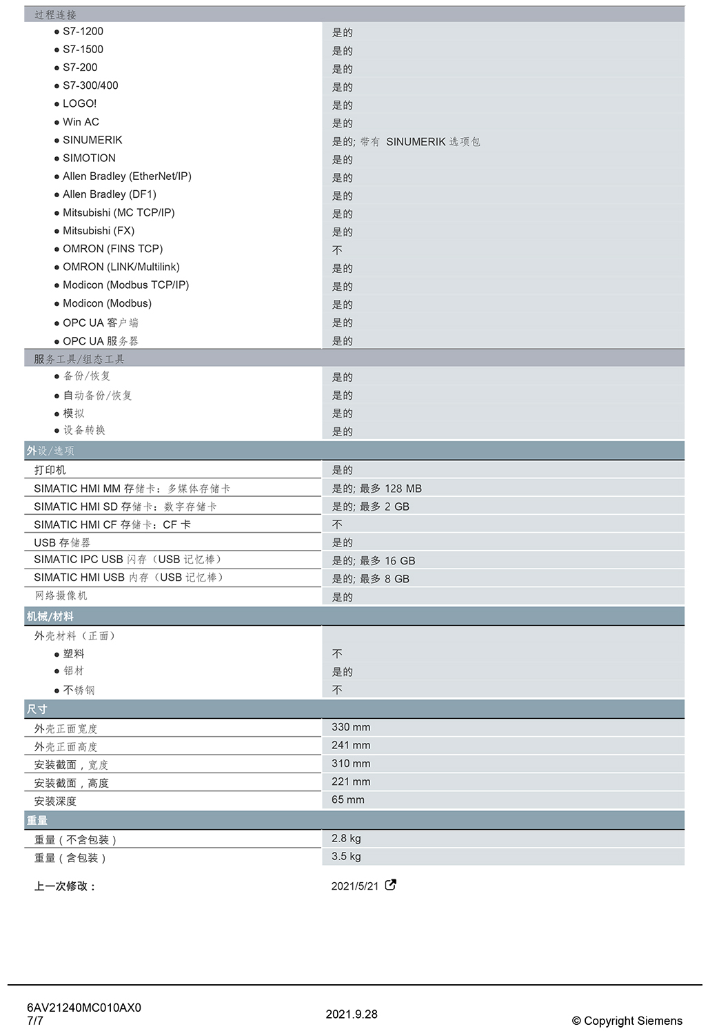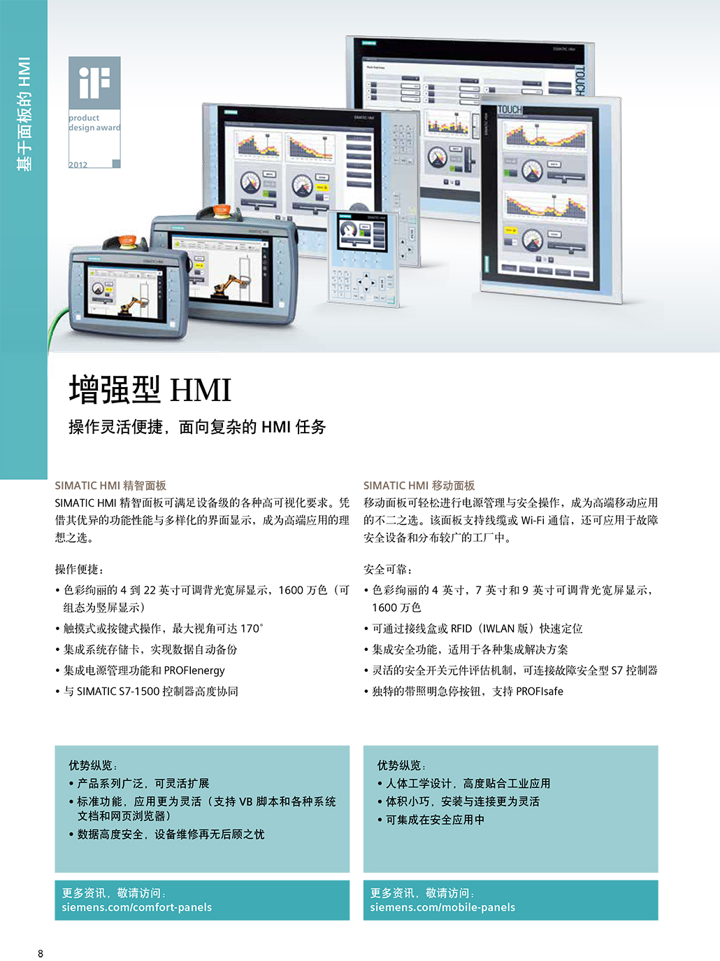 寬屏幕顯示尺寸從4in到22in(1in=0.0254m),可進行觸摸操作或按鍵操作;有效的節能管理;萬一發生電源故障,可確保百分百的數據安全;使用系統卡來簡化項目傳輸;可在危險區域中使用;同時支持PROFIBUS/MPI接口和PROFINET(LAN)接口;支持多種通信協議,例如:PROFIBUS、PROFINET以及方協議。