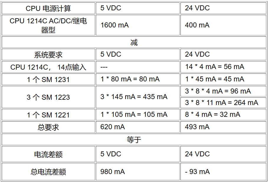 以下實例是PLC電源計算實例,該PLC 包括一個CPU 1214C AC/DC/繼電器型、1xSM 1231 4x13位模擬量輸入、3xSM 1223 8 DI輸入/8繼電器輸出和1xSM 1221 8DI輸入。該實例一共有46點輸入和34點輸出。電源需求如下表8.所示