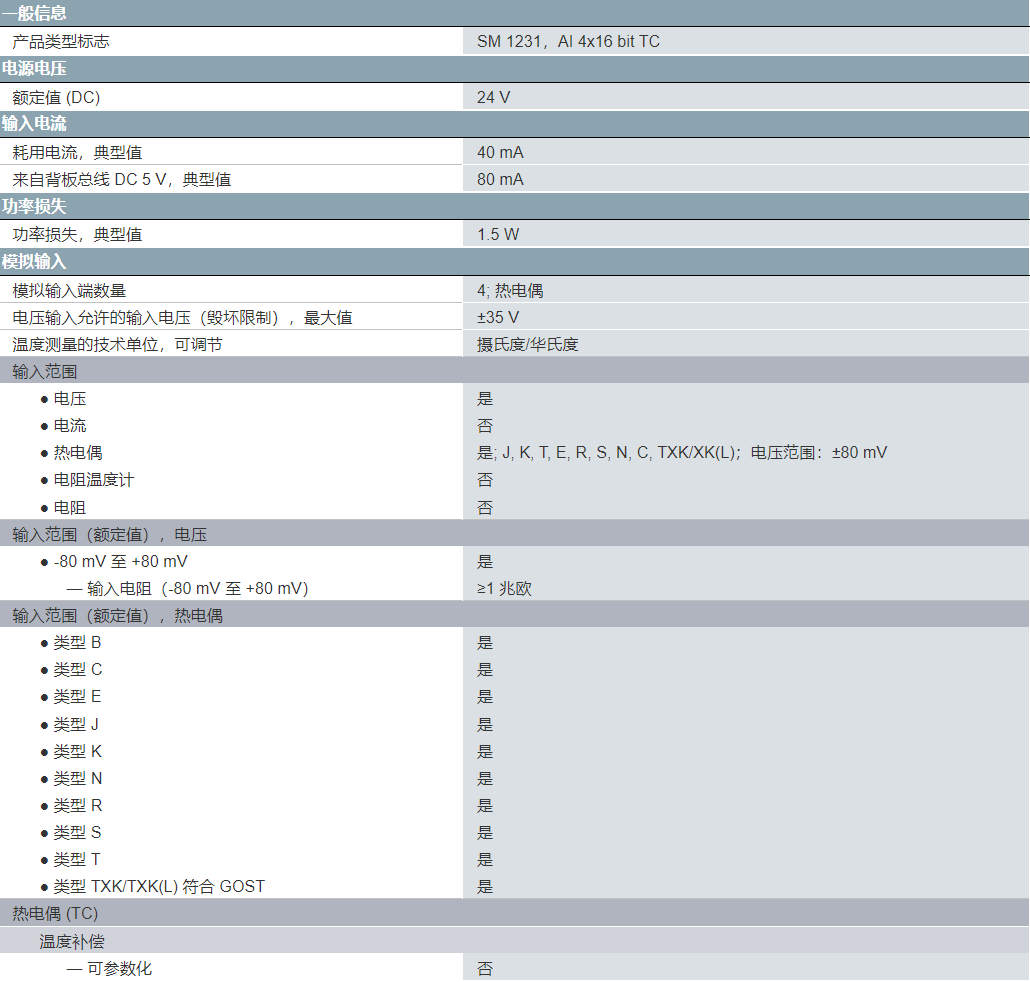產品類型 SIMATIC S7-1200 熱電偶4模擬輸入 SM1231TC