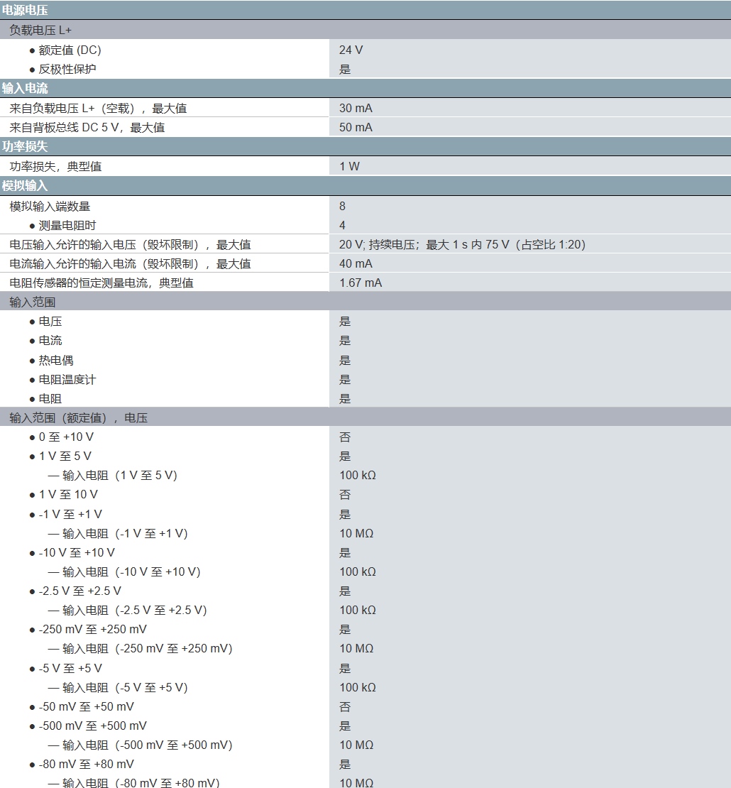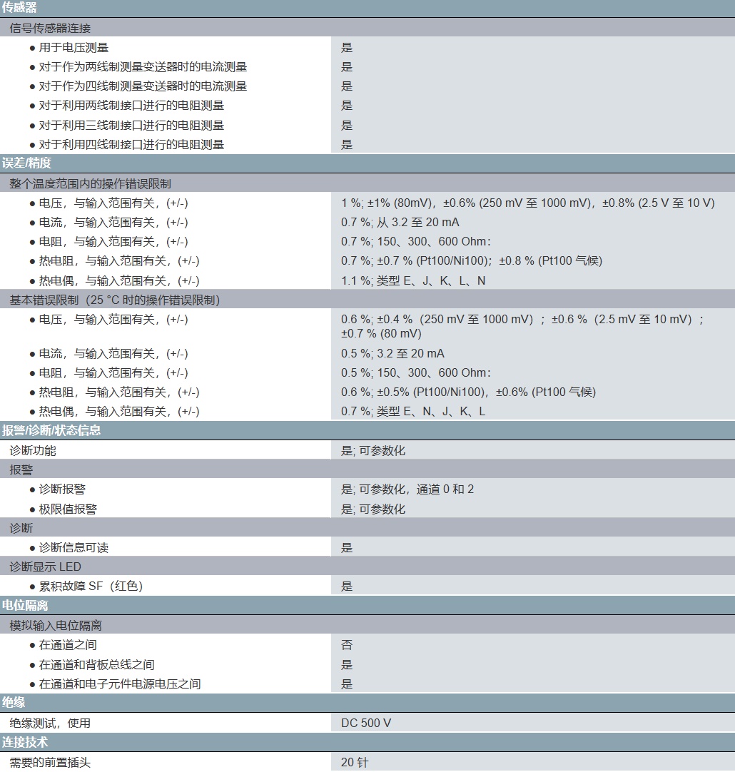 SIMATIC S7-300,模擬輸入 SM 331,電位隔離, 8 模擬輸入,分辨率 9/12/14 位, U/I/熱電偶/電阻, 報警,診斷,1個 20針 拔/插利用 激活的背板總線