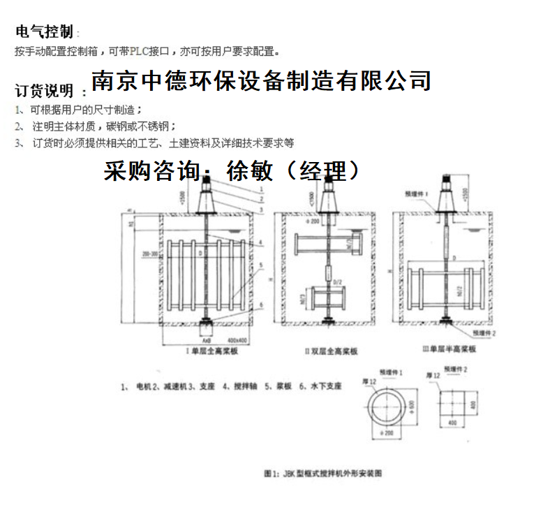 框式攪拌機適用工況及安裝圖;JBK-1400絮凝攪拌機技術參數表及外形尺寸