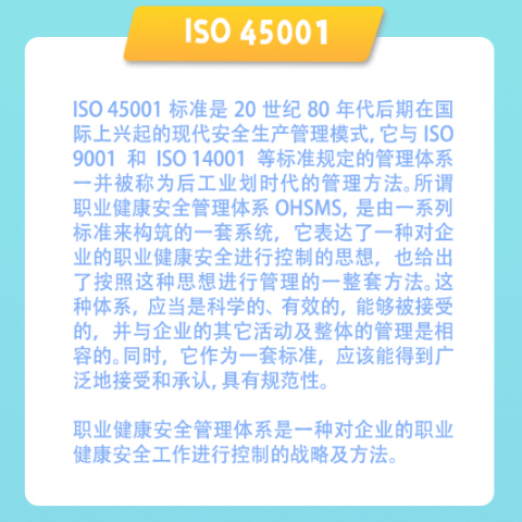 健康職業管理體系認證包括ISO 45001OHSAS 18001兩種標準,它們都是基于ISO 9001質量管理體系標準的擴展,但有一些區別和特點。