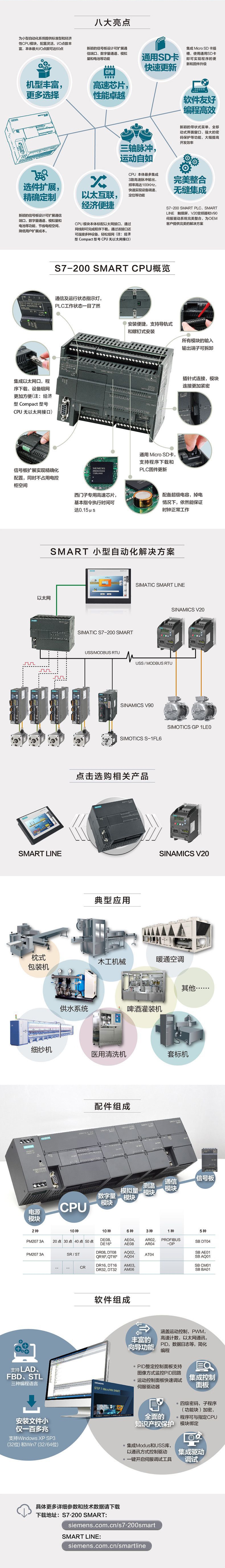 5.三軸脈沖,運動自如CPU模塊本體多集3路高速脈沖輸出,頻率高達100 kHz,支持PWM/PTO輸出方式以及多種運動模式,可自由設置運動包絡。配以方便易用的向導設置功能,快速實現設備調速、定位等功能。6.通用SD卡,快速更新本機集成Micro SD卡插槽,使用市面上通用的Micro SD卡即可實現程序的更新和PLC固件升級,地方便了客戶工程師對終用戶的服務支持,也省去了因PLC固件升級返廠服務的不便。7.軟件友好,編程在繼承西門子編程軟件強大功能的基礎上,融入了更多的人性化設計,如新穎的帶狀式菜單、全移動式界面窗口、方便的程序注釋功能、強大的密碼保護等。在體驗強大功能的同時,大幅提高開發效率,縮短產品上市時間。8.整合,無縫集成SIMATIC S7-200 SMART可編程控制器,SIMATIC SMART LINE觸摸屏,SINAMICS V20變頻器和SINAMICS V90伺服驅動系統整合,為OEM客戶帶來高性價比的小型自動化解決方案,滿足客戶對于人機交互、控制、驅動等功能的需求。