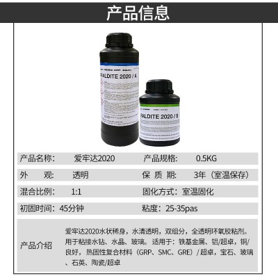 Araldite2020環氧粘合劑是一款透明性和流動性非常好的環氧膠粘劑,具有良好的粘接強度和長時間的適用期。非常適用于玻璃、陶瓷等要求透明性非常好及強度要求高的產品的粘接和修復