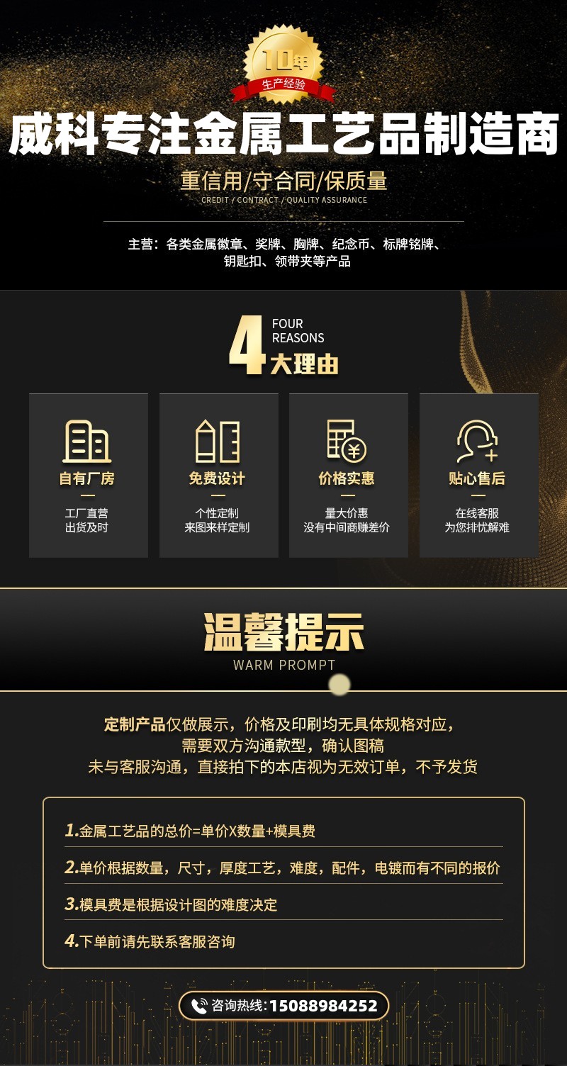 公司簡介 溫州威科工藝品有限公司成立于2001年,坐落于美麗的禮品之鄉,溫州平陽縣,公司卓立于生產銷售各類金屬禮品,從原先的鐵制合金紀念章到現在的純金純銀紀念章,品類多,質量好,設備好,秉承以客戶之上的理念,在發展中求生存,公司承諾,任何設計免費,破損補寄,等等,一直服務于國內外客商,歡迎廣大客商前來參觀指導。