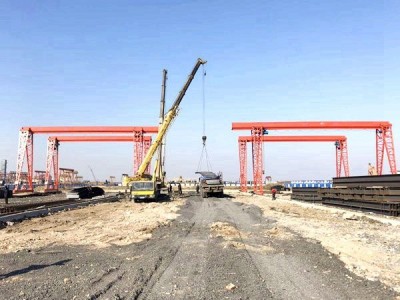 即將發(fā)往青海的兩臺(tái)100噸   龍門吊,該龍門吊跨度42米,起升高度16米,總重約90噸。