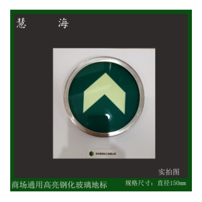 基本說明:該產品采用上8mm下5mm的雙層高強度鋼化玻璃,中間夾圓d=150mm夜光pvc標志,通過夾膠工藝制作合成一體,總尺寸:d=150mm,h=13mm,可按客戶要求加工、定制