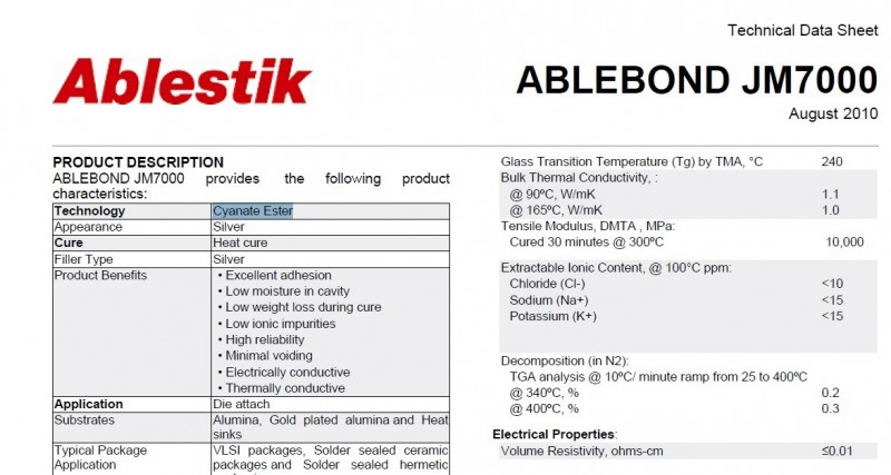 產品名稱:軍工集成電路芯片粘接用導電銀膠JM7000耐高溫低放氣