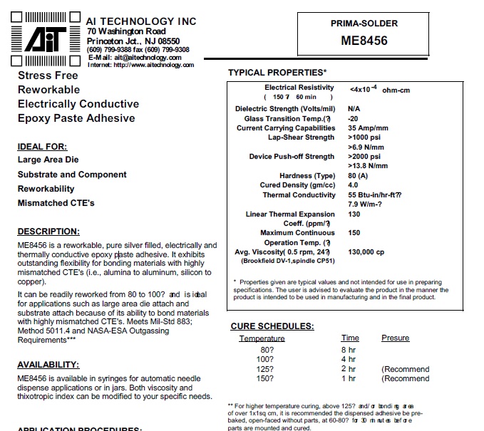 美國AiT柔性單組份環氧導電銀膠芯片粘接銀膠ME8456是一種可返工的、純銀填充的、導電和導熱的柔性環氧糊狀粘合劑。對于具有高度不匹配CTE(即氧化鋁與鋁、硅與銅)的粘結材料,它表現出ZHUO越的靈活性 。由于其能夠結合具有高度失配CTE的材料,因此非常適合于大面積管芯連接和襯底連接等應用。符合Mil Std 883NASA-ESA排氣要求