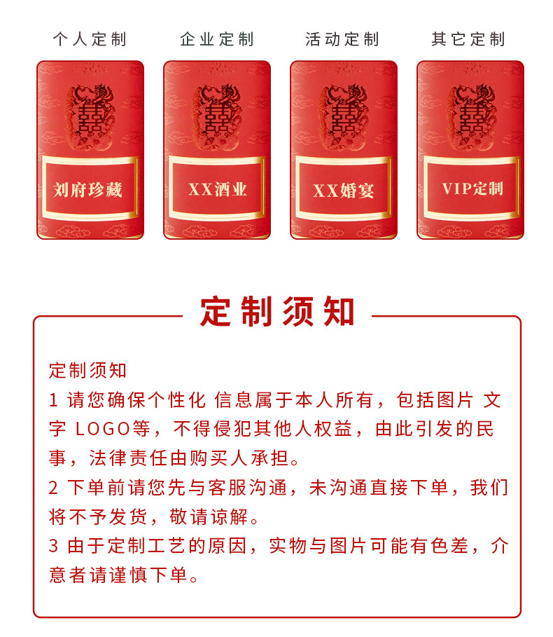 婚宴定制酒可以自己設計包裝,故能有檔次、夠大氣,酒體自己選擇,所以可以挑選原廠酒,這樣既能滿足大氣外觀又有高檔的酒體內(nèi)涵,可謂兩全其美。還可以避免因為買品牌酒被賓客知道價格的尷尬。