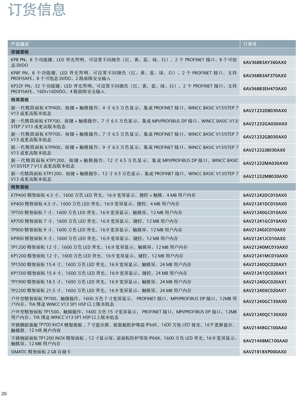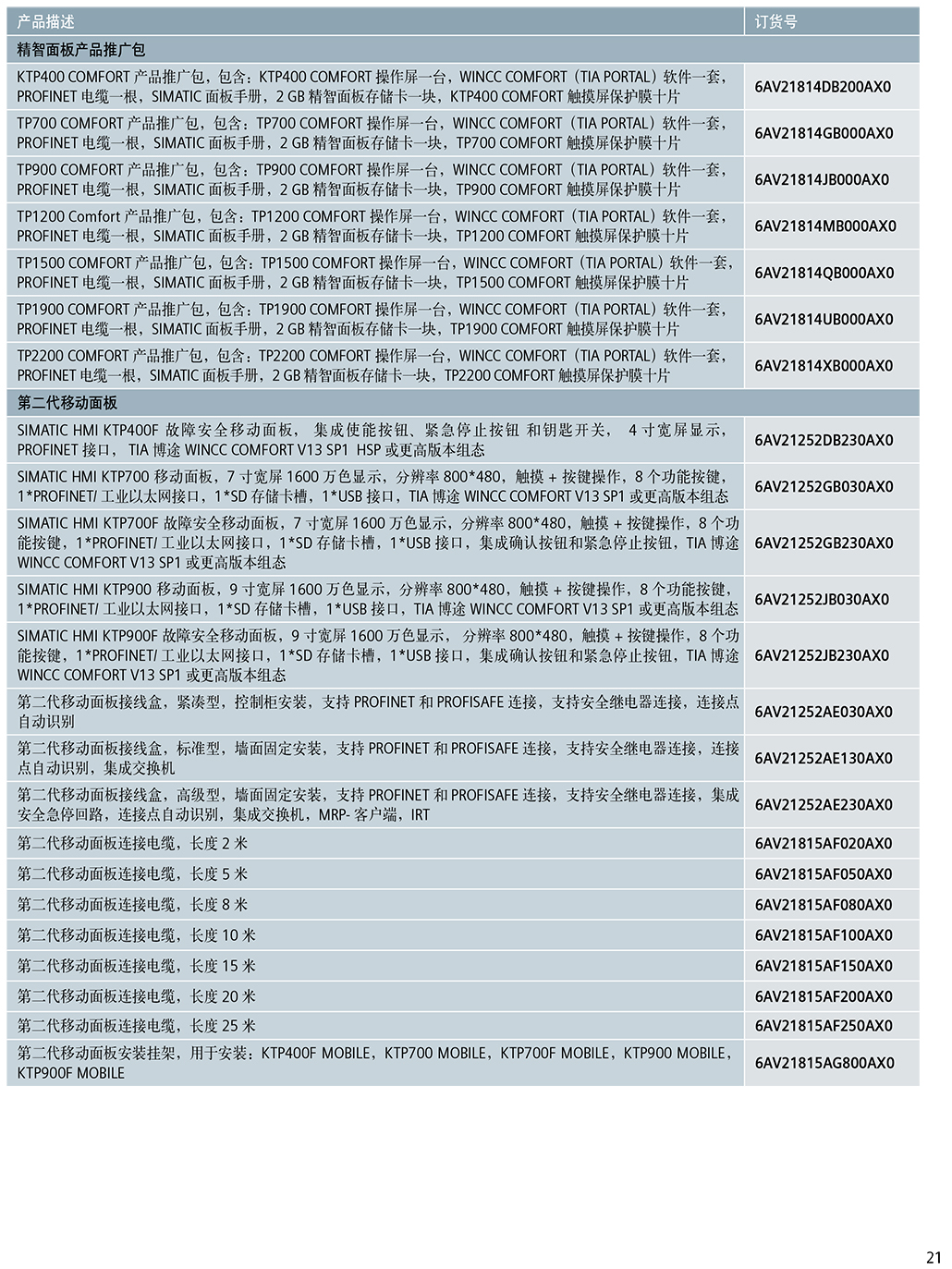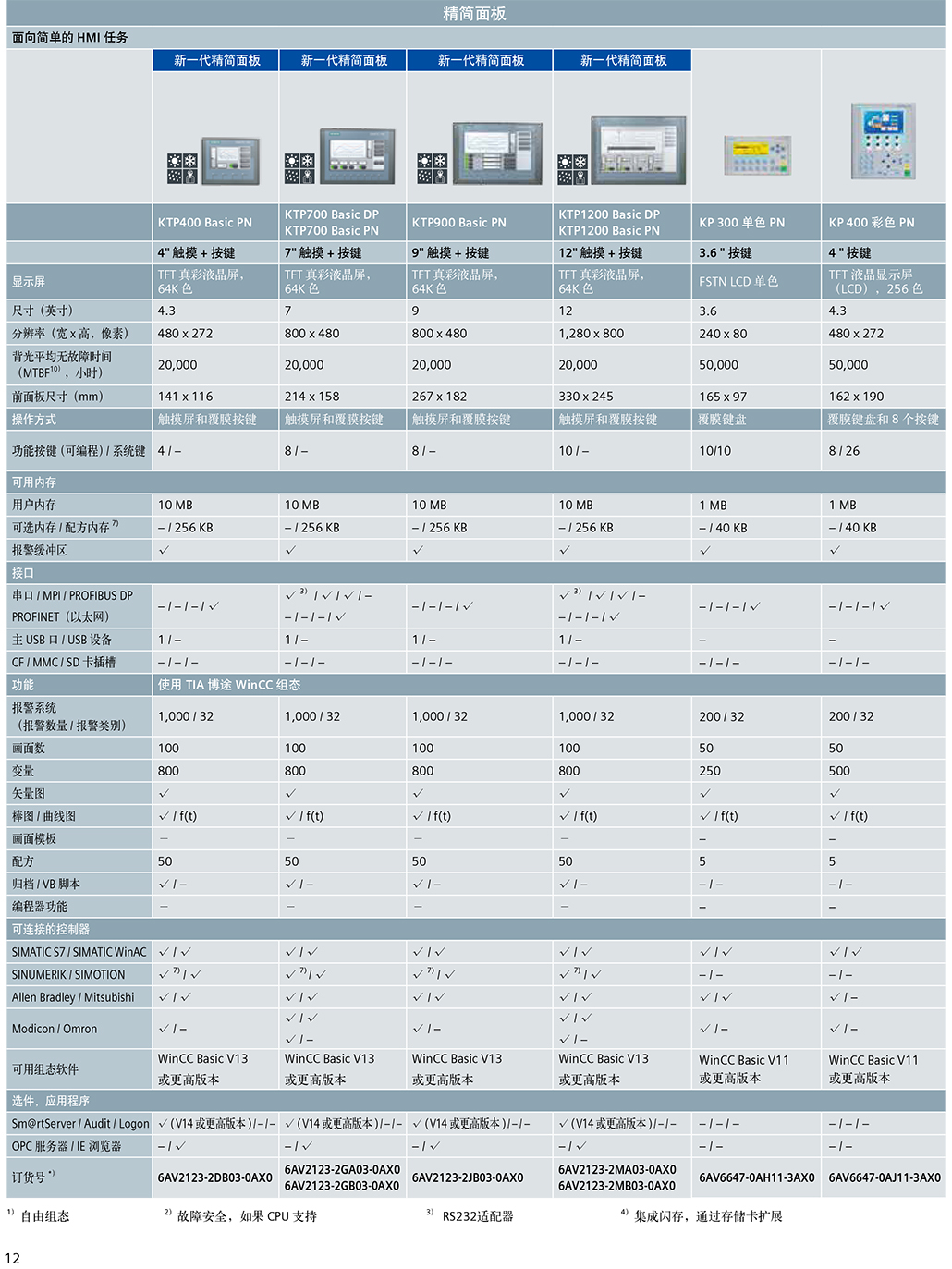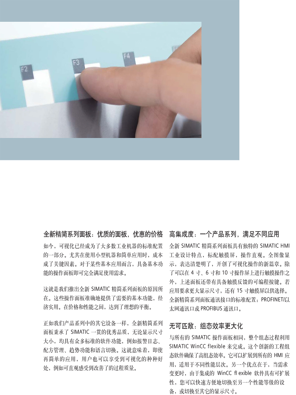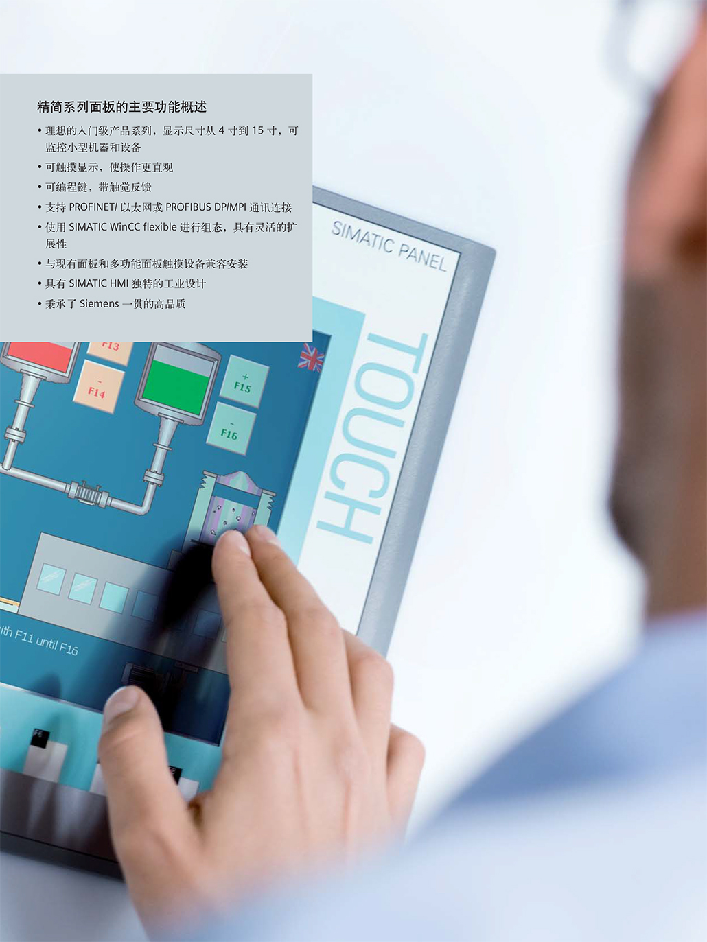 適用于不太復雜的可視化應用;所有顯示屏尺寸具有統一的功能;顯示屏具有觸摸功能,可實現直觀的操作員控制;按鍵可任意配置,并具有觸覺反饋;只有一種通信接口,PROFIBUS或PROFINET(LAN)接口;支持多種通信協議,PROFIBUS或PROFINET以及發協議。