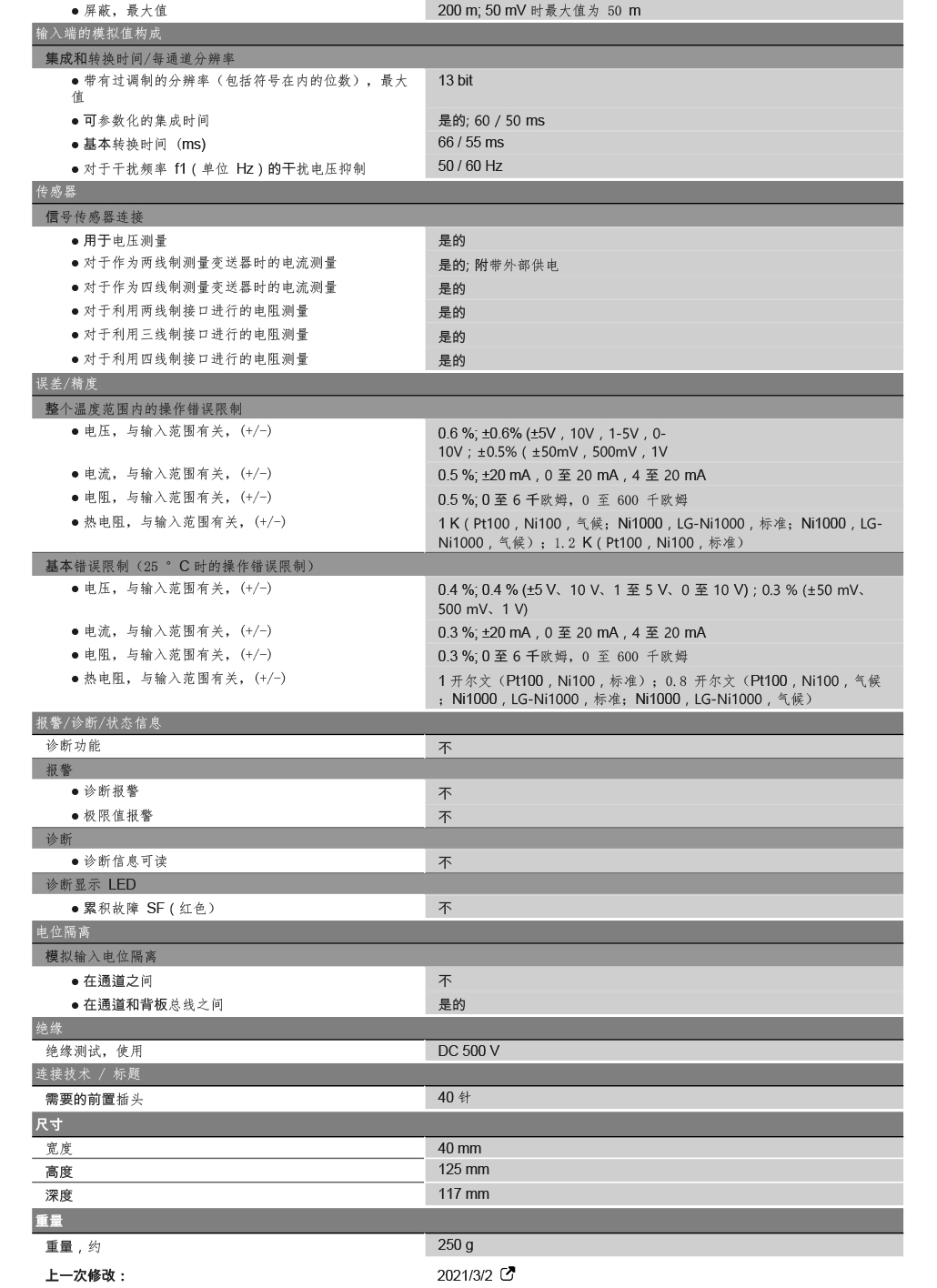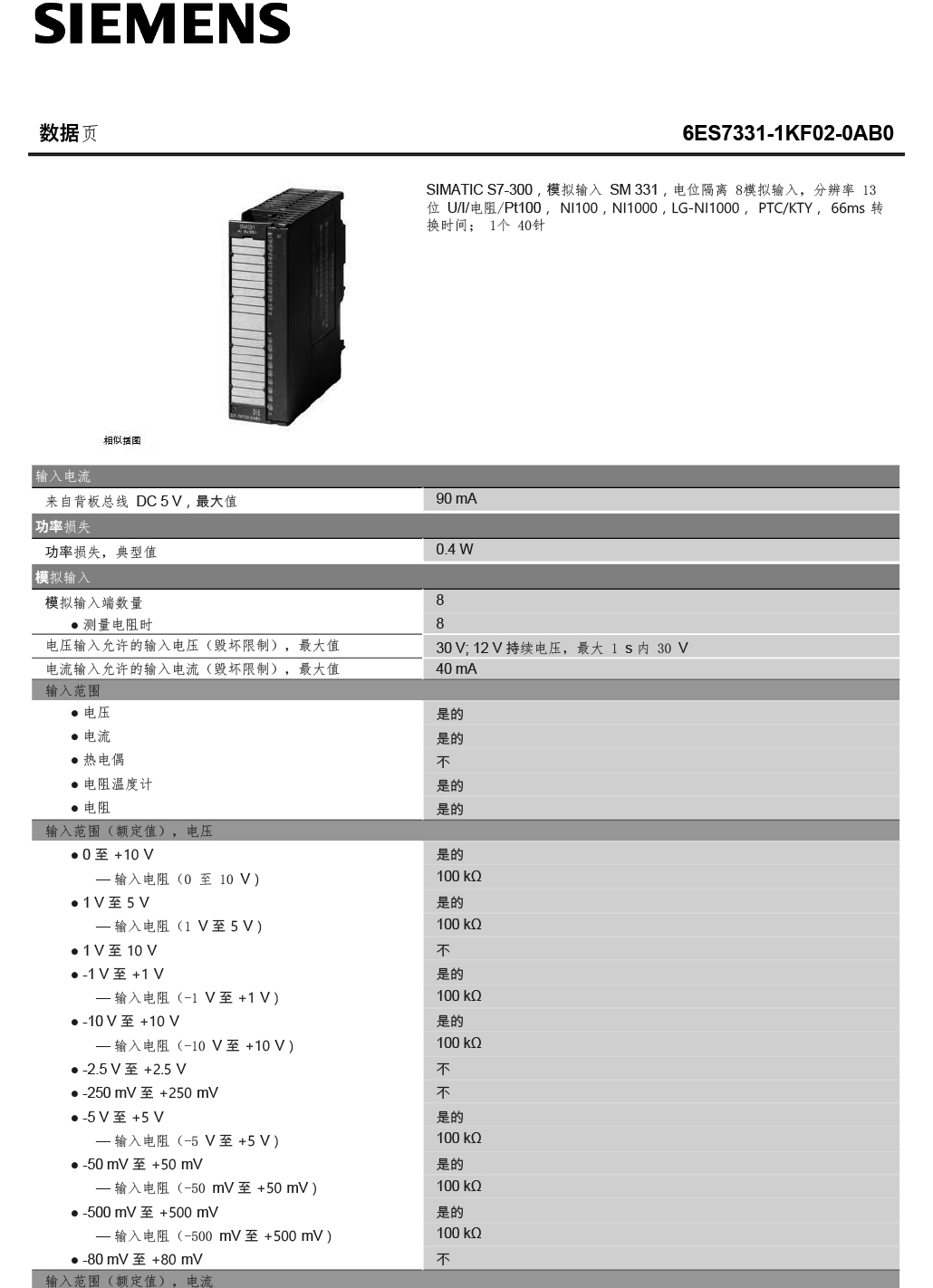 SIMATIC S7-300,模擬輸入 SM 331,電位隔離 8模擬輸入,分辨率 13 位 U/I/電阻/Pt100, NI100,NI1000,LG-NI1000, PTC/KTY, 66ms 轉換時間; 1個 40針
