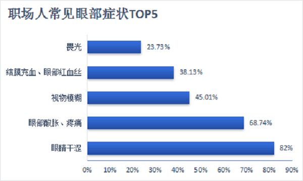 據(jù)2022職場(chǎng)人用眼報(bào)告》調(diào)查發(fā)現(xiàn),眼部問題呈現(xiàn)出普遍化特征,僅10.97%的職場(chǎng)人從沒有過任何眼部問題。其中,82%的職場(chǎng)人曾受到眼部干澀問題困擾;約七成會(huì)感覺眼部酸脹、疼痛;近一半職場(chǎng)人會(huì)因過度用眼導(dǎo)致視物模糊,而出現(xiàn)結(jié)膜充血、眼部紅血絲增加和畏光癥狀的人群占比分別為38.13%和23.73%。