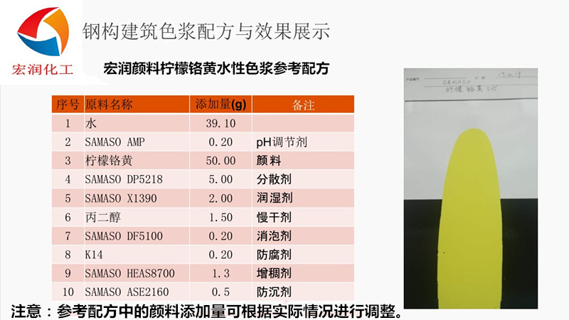 無機顏料:淺鉻黃、包膜淺鉻黃、中鉻黃、包膜中鉻黃、深鉻黃、包膜深鉻黃、檸檬鉻黃、包膜檸檬鉻黃、鉬鉻紅、鉬鉻紅、群青藍、高色素炭黑、華蘭(鐵藍、普魯士藍)。