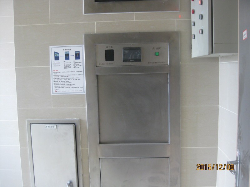 污物投入站體系設于每樓層,外部設有投入門,每層選用聯控回歸方法,預設緩沖口,不讓管內廢物彈出;投入門啟閉方法選用垂直主動升降式,投入門內設連鎖設備,同一時間作業時,只允許單一投入口打開。