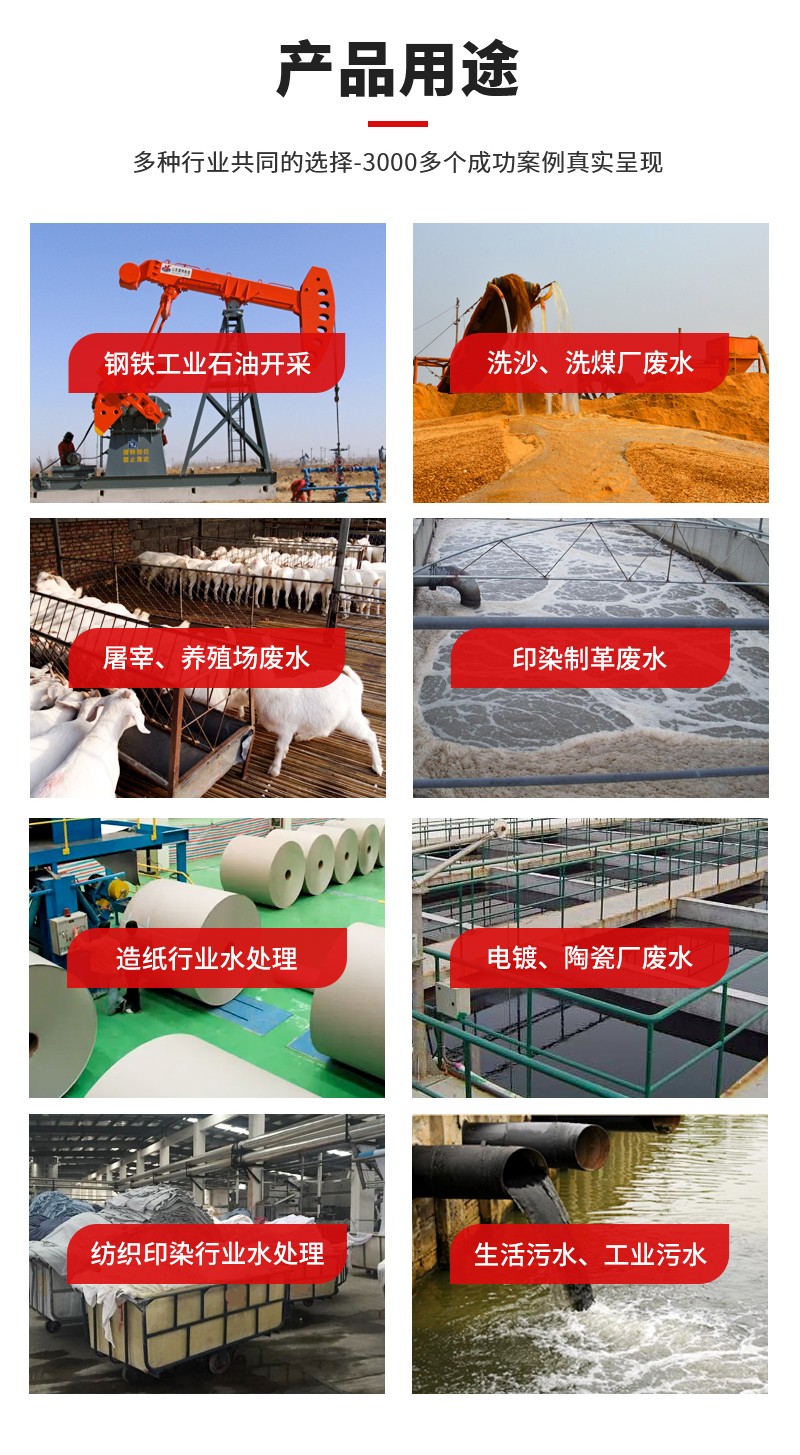 (2)可用于帶式、離心、螺旋脫水機的污泥脫水,可以顯著提高生產(chǎn)效率,泥餅的固含量及降低濾出水的固形物含量;
