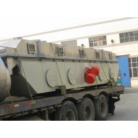 物料自進(jìn)料口進(jìn)入機(jī)內(nèi), 在振動力作用下, 物料沿水平方向拋擲向前連續(xù)運動,熱風(fēng)向上穿過流化床同濕料換熱后, 濕空氣經(jīng)旋風(fēng)分離器除塵后由排風(fēng)口排出, 干燥物料由排料口排出。
