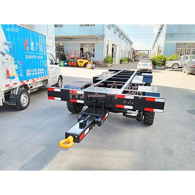 1.拖車底盤采用四輪平板車結(jié)構(gòu),具有牽引桿和轉(zhuǎn)向機構(gòu);