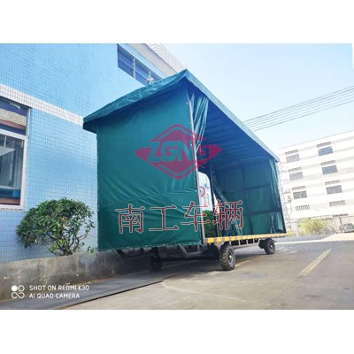 4噸雨篷平板拖車 重型移動工具拖車南工長年生產銷售,拖車無動力,一般叉車或牽引車牽引,實心胎免維護,是短途運輸的常見工具之一。