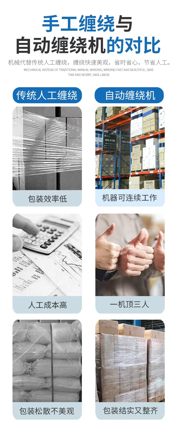 5、作為物力包裝的主力軍,機械化纏繞有著其他包裝不可比及的包裝成本優勢,美觀、節能、環保優勢等。