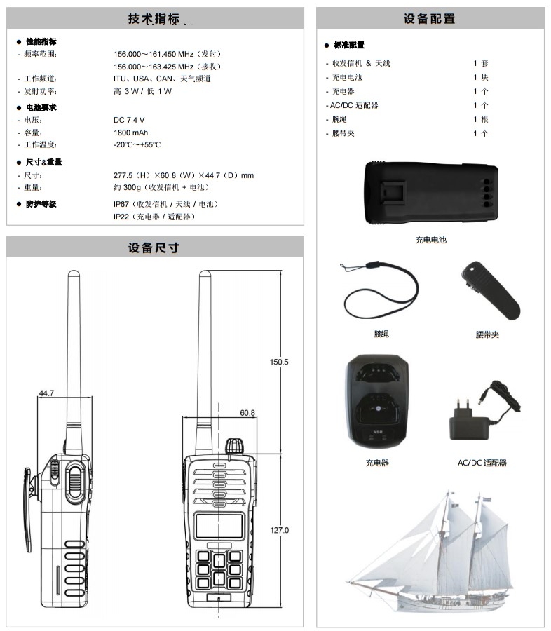 尺寸:277.5(H)×60.8(W)×44.7(D)mm(收發(fā)信機(jī)+天線+電池)