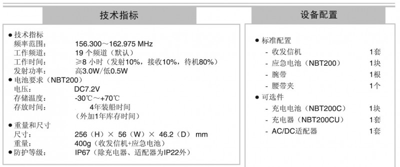 標配:1、收發信機x1;2、天線x1;3、應急電池x1;4、腰帶夾x1;5、腕帶x1;6、用戶手冊x1;7、CCS證書x1。(價格是標配)