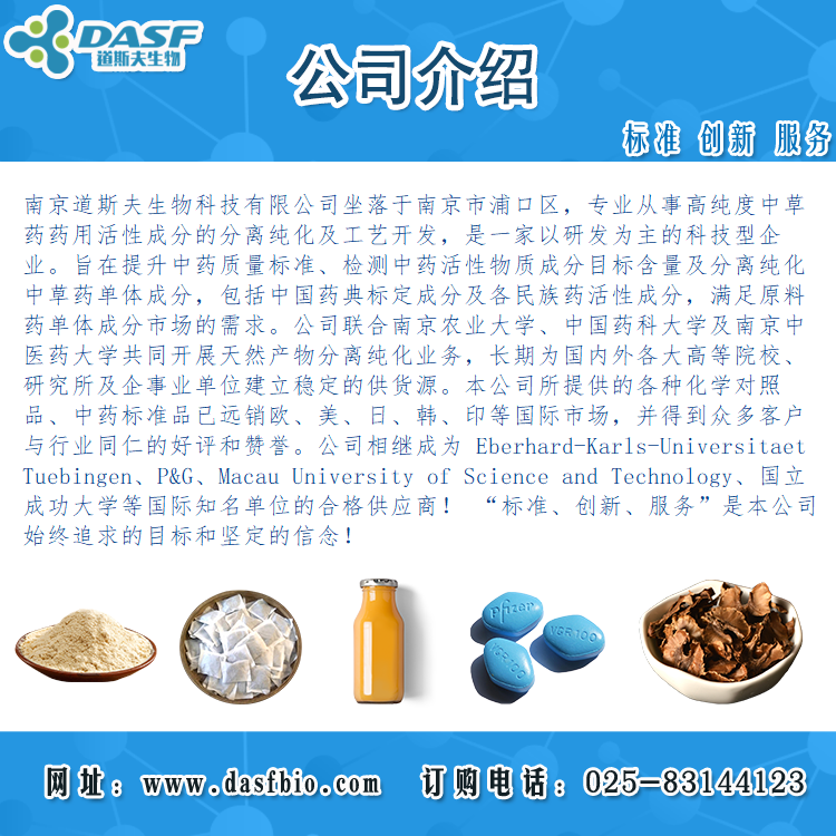 公司簡介 道斯夫生物(南京)坐落于南京六合化工園,專業從事高純度中草藥藥用活性成分的分離純化及工藝開發,是一家集研發、生產、銷售于一體的科技型企業。旨在提升中藥質量標準、檢測中藥活性物質成分目標含量及分離純化中草藥單體成分,包括中國藥典標定成分及各民族藥活性成分,滿足原料藥單體成分市場的需求。公司聯合南京農業大學、中國藥科大學及南京中醫藥大學共同開展天然產物分離純化業務,長期為國內外各大高等院校、研究所及企事業單位建立穩定的供貨源。本公司所提供的各種化學對照品、中藥標準品已遠銷歐、美、日、韓、印等國際市場,并得到眾多客戶與行業同仁的好評和贊譽。公司相...