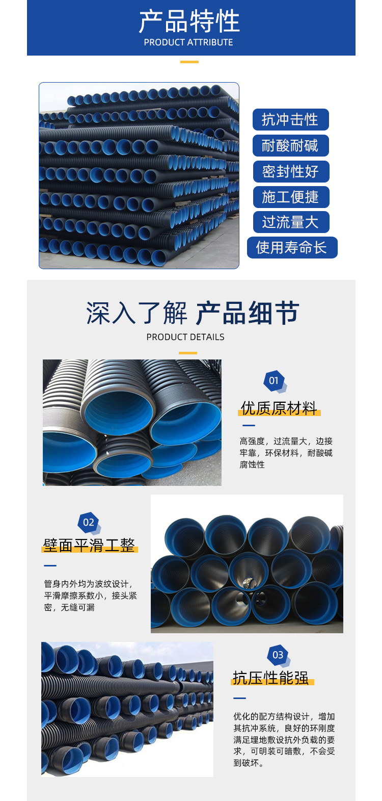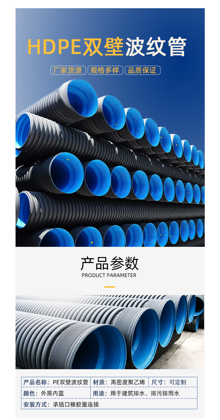 更新信息 快采購網供應商山西森云建筑材料有限公司供應PE雙壁波紋管高密度聚乙烯螺旋排污管分流下水道黑色市政排水管,為您提供詳細的產品報價、參數、圖片等商品信息,本產品于2023-01-04 10:22更新,主要更新內容為:產品類別、產品參數、產品價格、產品圖片等信息。如需進一步了解PE雙壁波紋管高密度聚乙烯螺旋排污管分流下水道黑色市政排水管詳細信息,請與廠家直接聯系,并說明是在快采購網看到這條商機的。
