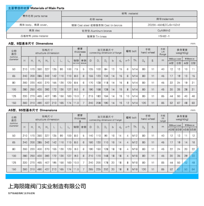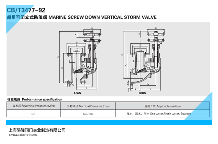 船用防浪閥CB/T3475-1992,船用立式防浪閥CB/T3476-1992,船用可閉立式防浪閥CB/T3477-1992,型式;A型 AS型 B型 BS型公稱壓力;PN0.1Mpa,公稱通徑;DN50-DN150mm,適用介質;海水,淡水,污水,閥體 閥蓋;鑄鋼/錫青銅,閥盤;錫青銅,壓板;黃銅,閥桿;鋁青銅。