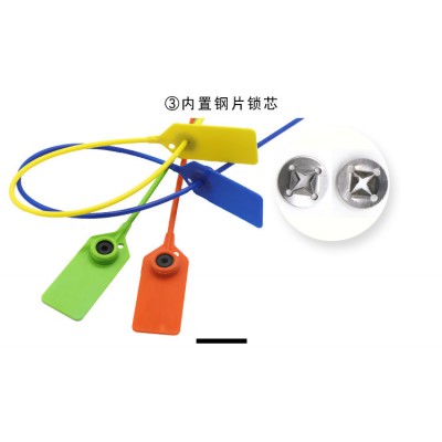 塑料封條制作工藝:封條采用PP塑料封條一次注塑成型,封條內夾有鋼片,產品在零下45度,零上50度不變型,表面采用沖壓或激光打標志、流水號、條碼,鎖桿為2*5扁桿,施封塑料封條時隨意調節抽緊,顏色可制成紅、蘭、綠、黃,也可根據用戶要求制作成其他顏色等。拉力可達F≥60KG。