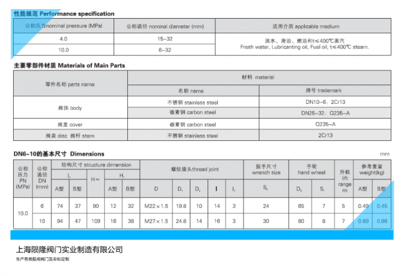 公司簡介 上海隕隆船用閥門有限公司是一家集研制、開發、生產、銷售于一體的現代化專業閥門制造企業,是中國閥門協會會員、中石油一級供應網絡成員單位、中國船舶工業聯營企業、中國船用機械標準化技術委員單位、全國閥門標準化技委員會成員。 ??公司技術力量雄厚,設計經驗豐富,生產設備精良,生產工藝先進,檢測手段齊全,體系運作嚴密,嚴格的管理孕育出優質可靠的產品。公司產品均采用國標GB、部標CB、JB、日標JIS、美標API、德標DIN、外貿標準CBM等技術條件及圖紙制造,現在品種已達200多個系列、2000多個規格。主要產品有各種規格的船用蝶閥、閘閥、截止閥、球閥、針型閥、調節閥、節流閥...