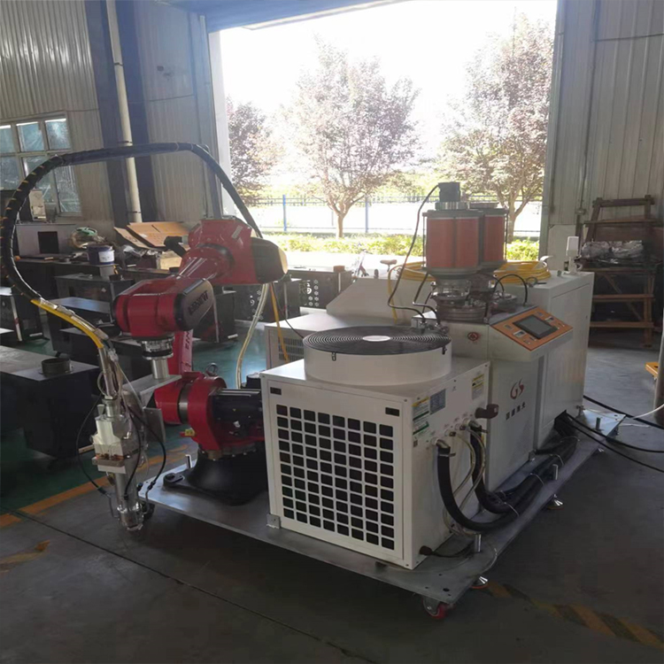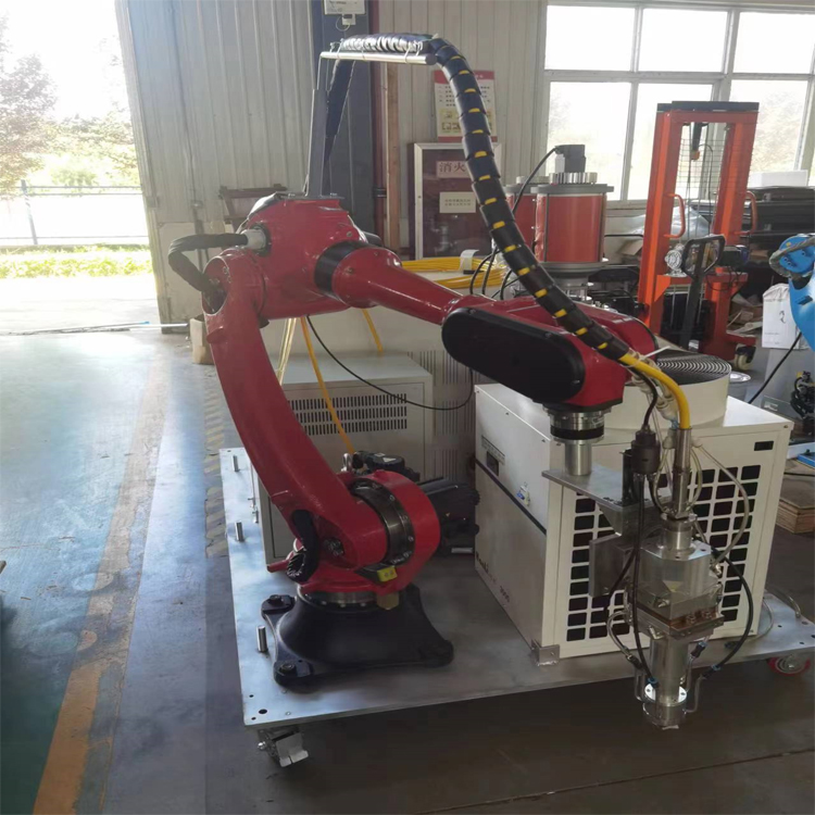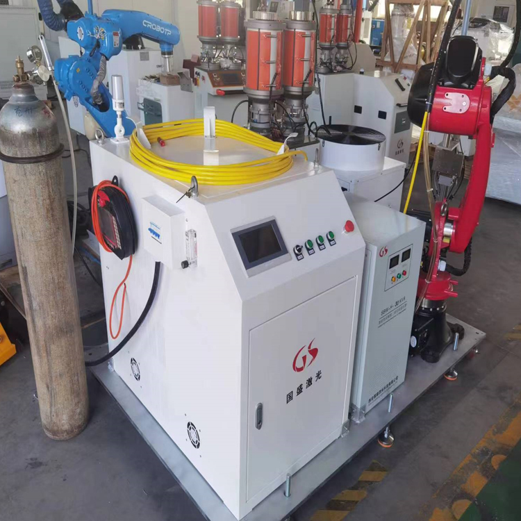 移動式激光熔覆設備主要由前端執行器和后端設備組成。前端執行器由多軸工業機器人、移動小車及電氣控制系統、送粉機構、激光熔覆頭和熔覆噴嘴組成。后端設備由高功率光纖激光器、水冷器、電源電箱和保護氣組成。移動式熔覆設備幾乎是大型設備維修現場的維修選擇,尤其是對于那些無法拆卸和運輸的部件。
