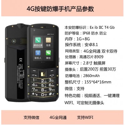 本安防爆標識:Exib IIC T4 Gb防護等級:IP68防水防塵內存:1G+8G操作系統:安卓8.1網絡類型:4G全網通雙卡雙待處理器:高通芯片8909屏幕尺寸:2.8寸觸摸屏攝像頭:后置200萬前置30萬防爆電池:2860mAh整機尺寸:155*64*16mm微信:支持特色功能:視頻通話、一鍵清理WIFI、可定制無攝像頭