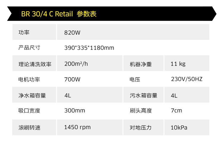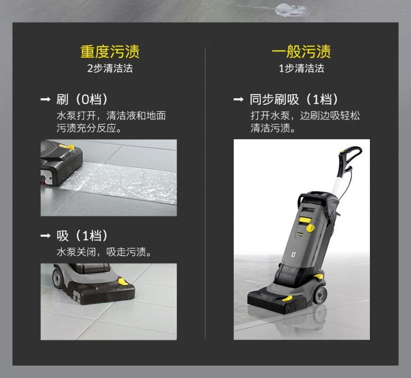 卡赫洗地機BR 30/4 C,機器采用直立式設計,和直立式吸塵器一樣便于操縱。與拖把相比,與地板的接觸壓力更高,清洗力量更強。刷子的轉速為每分鐘1500轉。機器可以向前和向后抽吸。對于粘性很強的污漬,可以通過踏板抬高刷吸耙高度來加強持續的對地面接觸力。