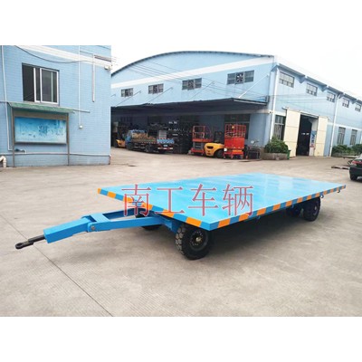 6噸無動力叉車牽引平板拖車 藍色,佛山南工車輛長期非標訂制,牽引平板拖車無動力,主要用于碼頭、工廠、港口等場區內運輸。